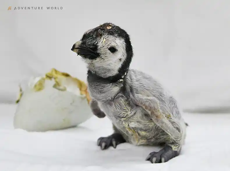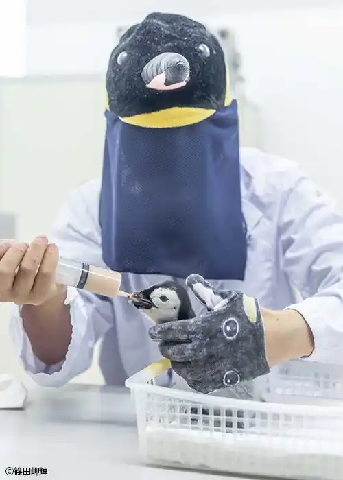 初期人工育雛の際、スタッフは親鳥に扮して⾚ちゃんを育てます。 「生まれて初めて見た動くものを親と認識する」という鳥類の習性を利用し、スタッフがペンギン型の帽子を被り、ペンギンの嘴に見立てた手袋を装着します。声は一切発さずに録音した親鳥の鳴き声を聞かせながら食事を与えます。 |