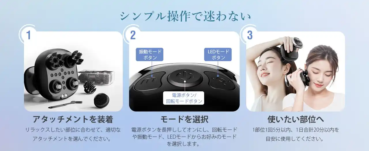 持続振動と断続振動の2つのモードを備え、最大約9,000回/分の高速振動で汚れや老廃物を浮かせて取り除きます。シャンプー時の使用で、頭皮を柔らかく整え、毎日のケアを快適にサポート。※振動OFFも可能です。 |