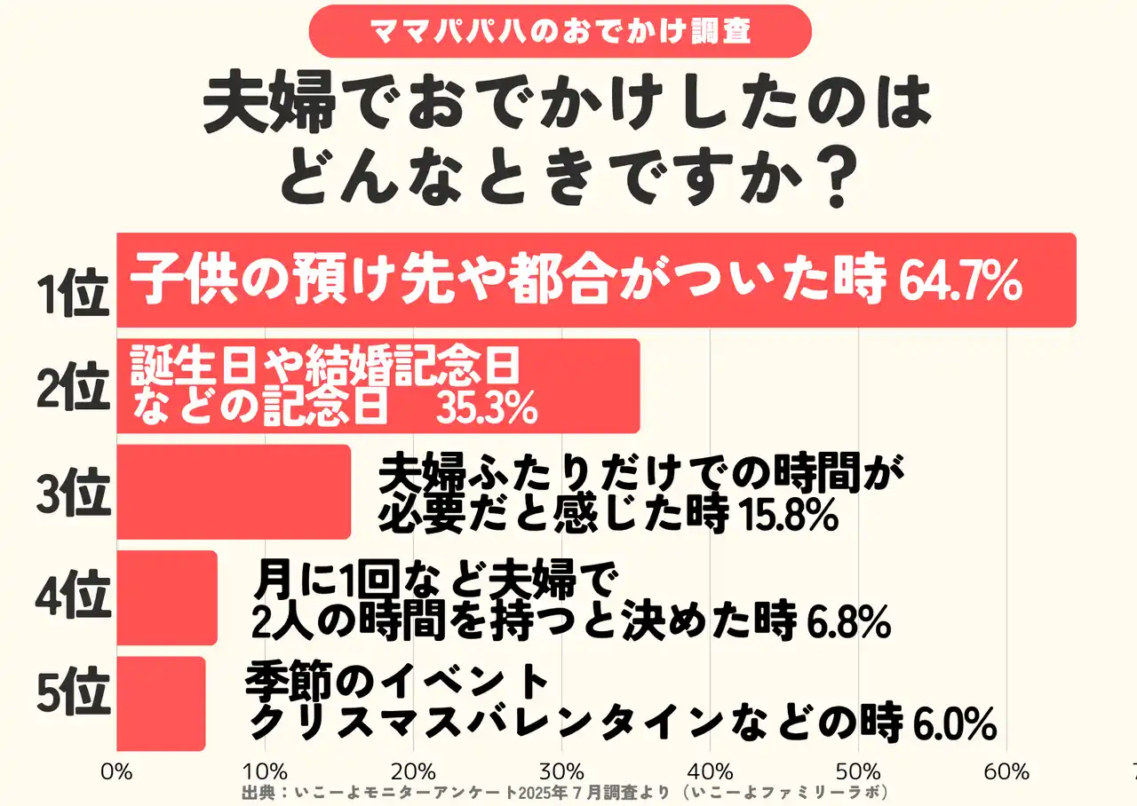 | 夫婦でおでかけしたときについても聞きました。圧倒的な1位が「子供の預け先や都合がついた時」(64.7%)。 | ||||||||||||