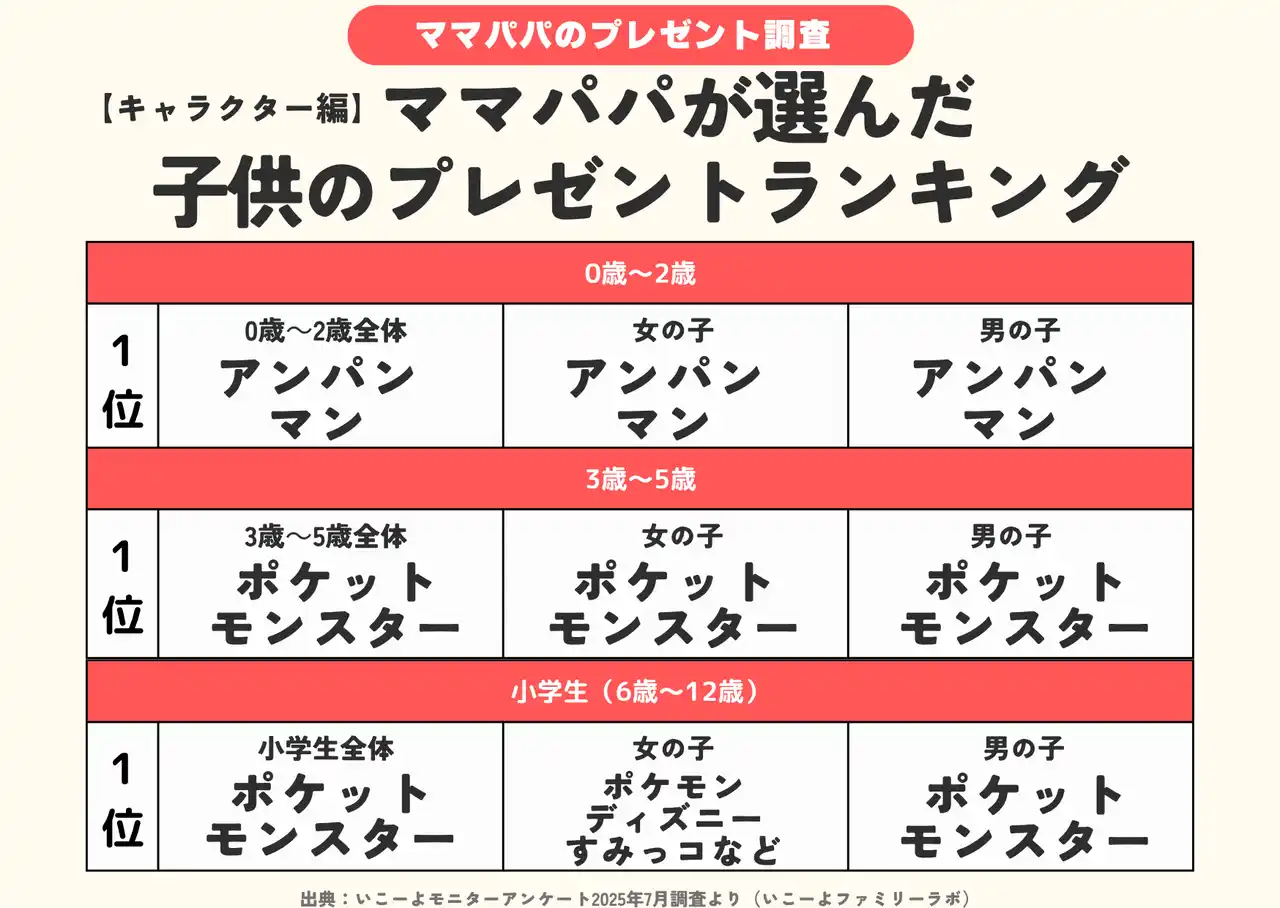 いこーよファミリーラボ調査!こちらもチェック! 子供のプレゼントの人気キャラクターは? |