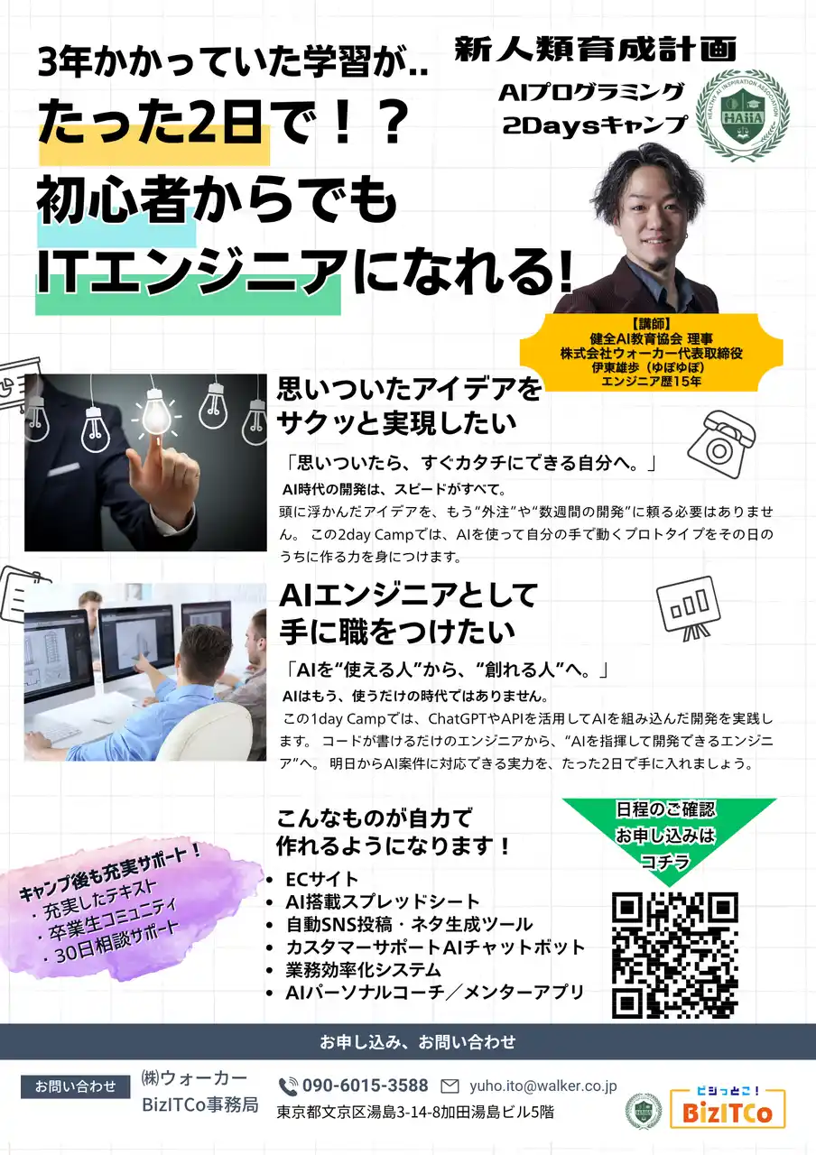 株式会社ウォーカー(本社:東京都文京区、代表取締役:伊東雄歩)は、一般社団法人 健全AI教育協会(HAIIA、所在地:東京都港区)と正式に提携し、伊東雄歩が同協会の理事に就任しました。 AIを正しく理解し創造的に活用できる人材育成を目的として、「新人類育成計画/AIプログラミング2Daysキャンプ」および「なぜか“面白い人”が集まる!交流会」を共催。 教育・実践・交流を通じて、生成AI時代にふさわしい“健全な教育”の普及を目指します。 |