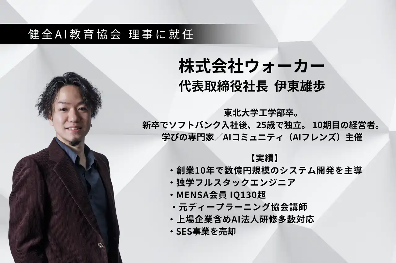 | 株式会社ウォーカー代表取締役・伊東雄歩が協会の理事に就任することで、ウォーカー側の経験と協会の教育基盤を融合し、AI教育・交流イベント等の共催運営を実現します。 | ||||||||||||