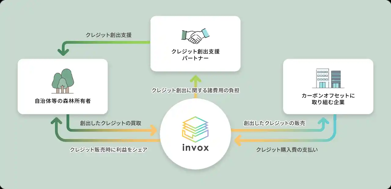 2025年6月に始動した環境保護・再生プロジェクト「invoxの森」では、クレジット創出支援パートナーと連携することで、 クレジット創出の支援からクレジットの活用、利益のシェアまで森林所有者をトータルにサポートしています。 |