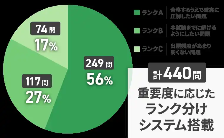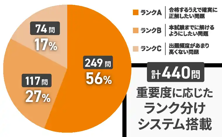 講師が過去問全年度を徹底分析し、全ての問題が重要度に応じて「A(合格するうえで確実に正解したい問題)」「B(本試験までに解けるようにしたい問題)」「C(出題頻度があまり高くない問題)」とランク付けされた過去問集が付属します。そのため優先順位をつけて効率的に学習を進めることができます。 過去問から厳選した問題についてはピックアップして講義で解説するため、解くだけではなく、しっかりと知識を身につけることができます。 過去問数が少なく重要な分野については、演習問題で補強していますので、十分な演習量が確保できます。 |