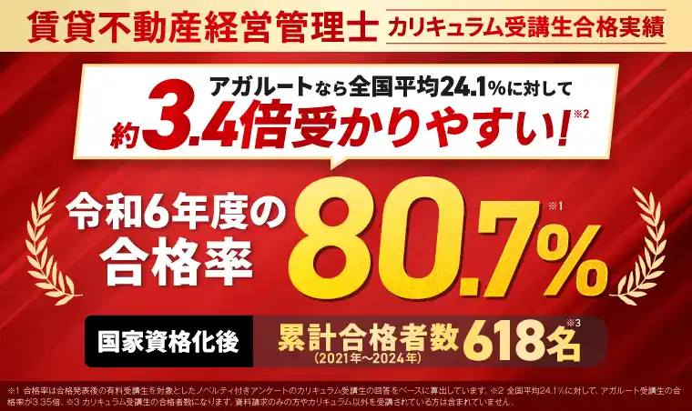 【賃貸不動産経営管理士を目指す全ての方へ】 隙のないカリキュラム設計! 合格率驚異の80.7%! 約3倍合格しやすい、 業界随一のパーフェクトカリキュラムが、さらにパワーアップ! |