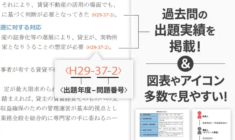 過去問の出題実績がテキスト内に記載されているので、重要度・頻出度がすぐにわかります。そのため、強弱をつけた学習がしやすい設計になっています。 また、理解しやすいように難解な表現は平易な表現に置き換え、図表やアイコンを多く用いているので、公式教本で挫折した方も視覚的にわかりやすく理解できます。 |