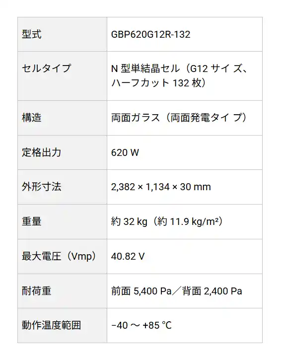 再生可能エネルギー、EV自動車部品、AIおよびIoT領域における先進技術を駆使し、グローバルに急速に成長している、~再エネ業界の風雲児~ GBP株式会社(本社:東京、以下GBP)は、自社ブランドの高出力両面発電パネル「GBP620G12R-132」を11月19日より発売します。最大出力620Wの高出力と、両面ガラス構造による高い剛性を兼ね備えた本製品は、大規模メガソーラー案件はもとより、強風や積雪といった過酷な環境下でも安定した長期稼働を実現します。