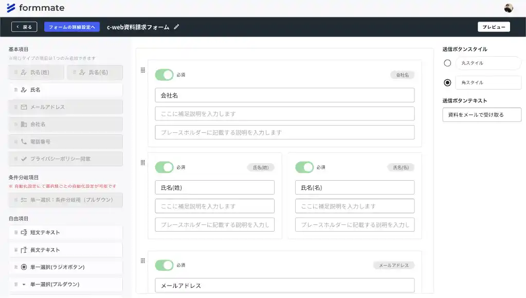 formmateは、最初のフォーム項目を「会社名・メールアドレス・氏名」といった最低限の必須項目に絞り込むことも可能です。 |