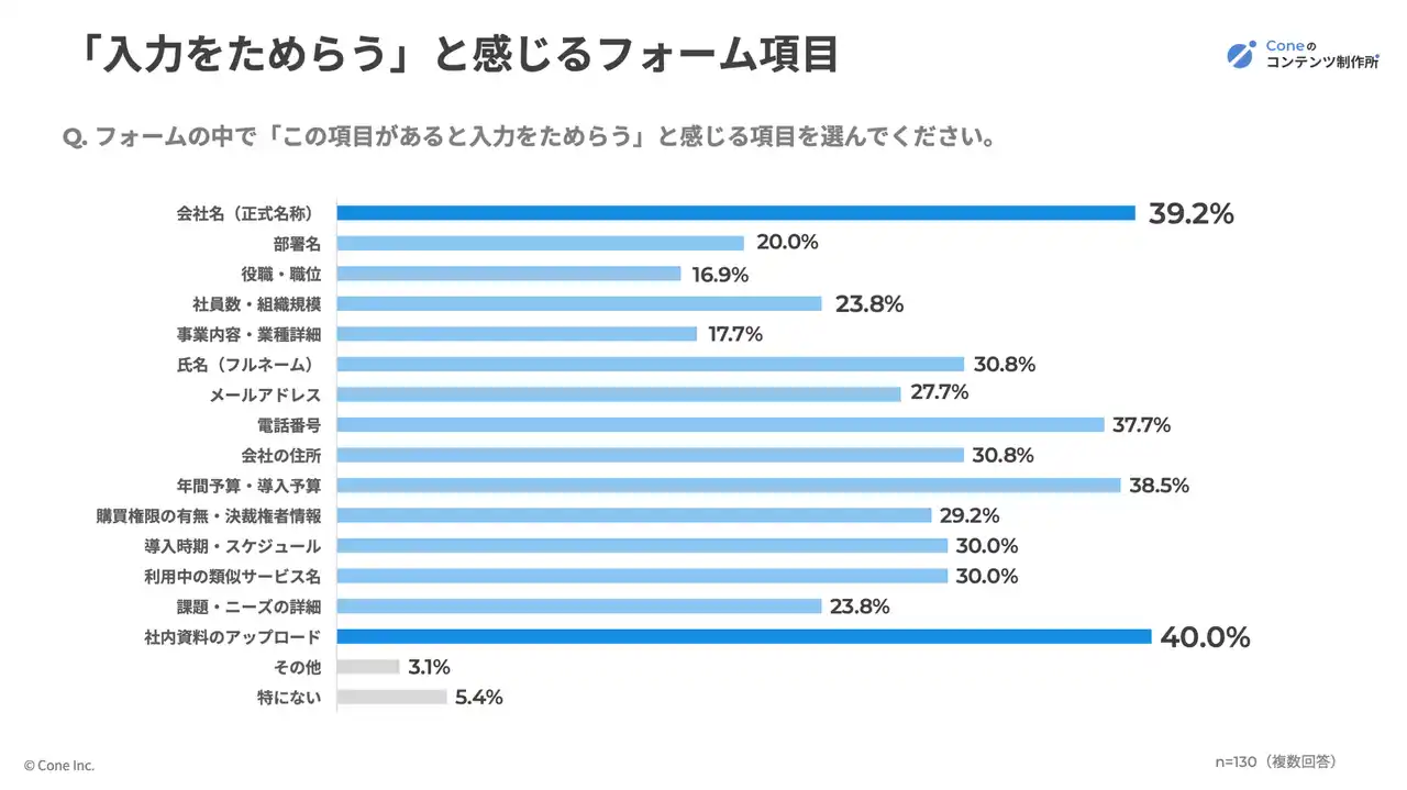入力者が入力を最も「ためらう」と感じる項目を分析した結果、単なる個人情報ではなく、企業の内部情報や営業接触に直結する項目が上位に挙がりました。 |