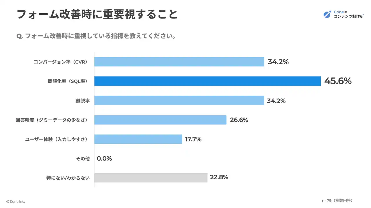 運用者側がフォーム改善で最も重視する指標は「商談化率」(45.6%)です。 |