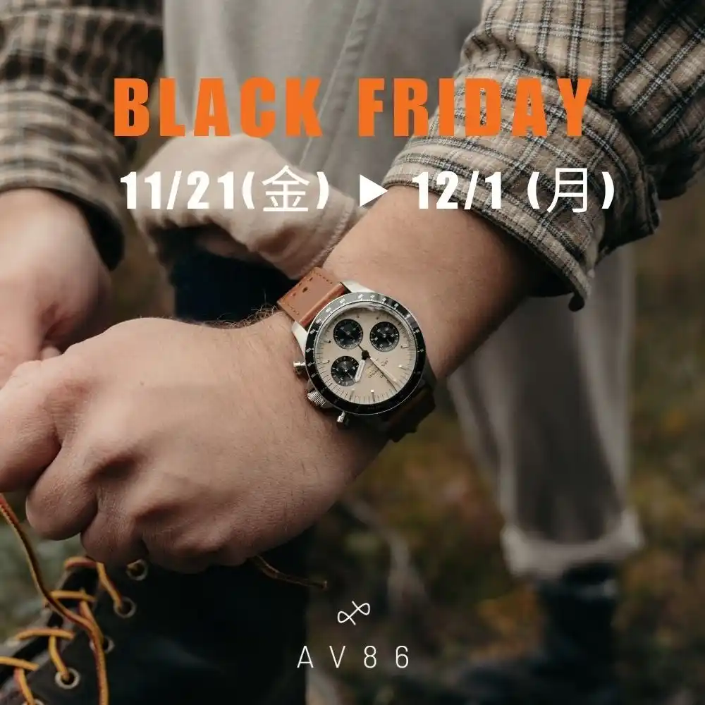 | AV86 は、「金庫に保管される資産のような時計に代わる、普段から愛用できる良質で、長年愛用できるような時計を、良心的な価格で造ること」というミッションを掲げて2014年に創業しました。このブラックフライデーのセールが年内で唯一の割引キャンペーンとなります。 | |||||||||||
