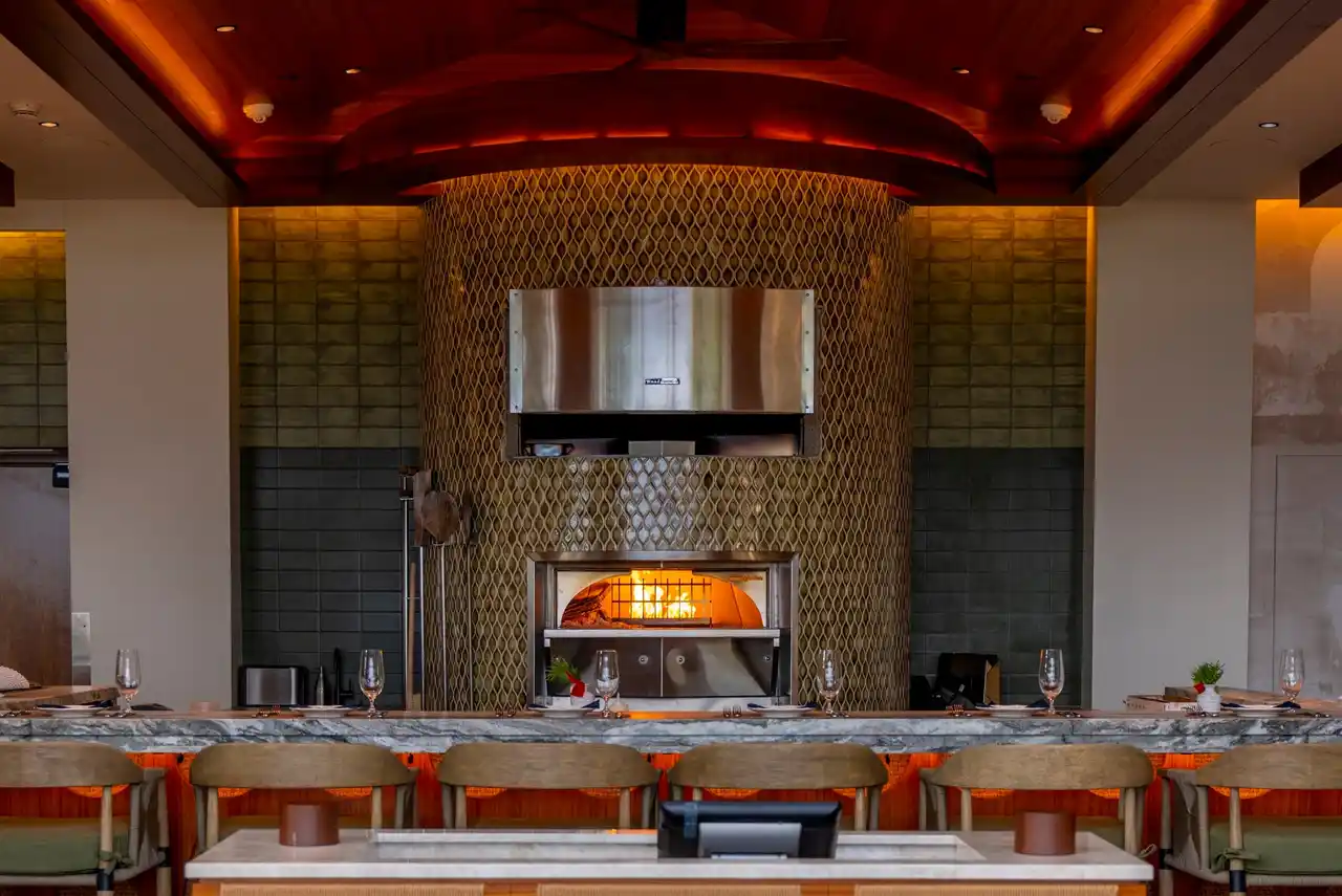 新たに導入された薪窯には、伝統的な趣と現代的な機能美を兼ね備えたウッドストーン社製の一流ピッツァオーブンを採用。イタリア製のセラミックモザイクタイルで波を思わせる優美なデザインが施され、オープンエアのレストランから望む紺碧の海と美しく調和しています。 |