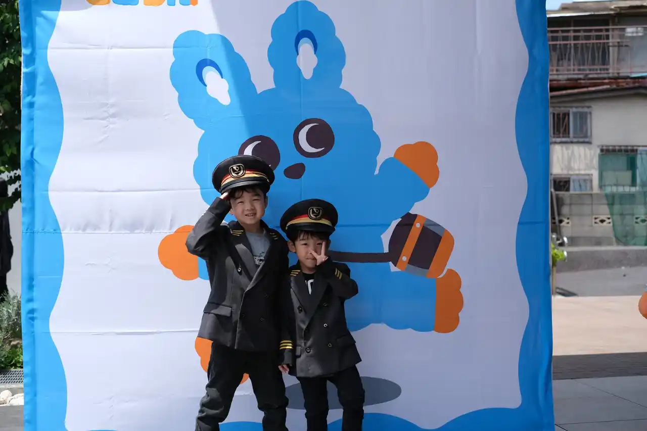 お子さま向けの駅長用帽子と制服を着用して、駅員さんと写真を撮ろう! |