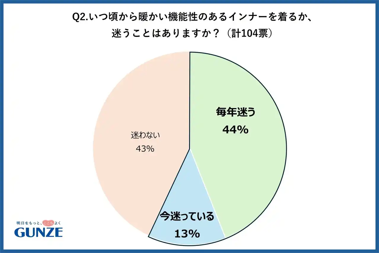 グンゼの公式Xを使用し、秋冬に着用するインナーについてのアンケート調査を行いました。「秋冬のコーディネートを選ぶ際、何を最優先に考えていますか?」という質問に対しては、『気温』と答えた人が79%でした。しかし、いつ頃から暖かいインナーを着るか、『毎年迷う・今迷っている』方は合計57%と、気温によって対策をしながらコーディネートを選びたいのに、タイミングが分からず迷う人が多いようです。 また、暖かいインナーに対するお悩みに関しては、『かゆい』が42%。次いで『汗冷えする』や『袖や襟から見えてしまう』といった回答もそれぞれ20%以上あり、気温に対する悩みだけでなく様々なインナー悩みがあることが分かりました。 |