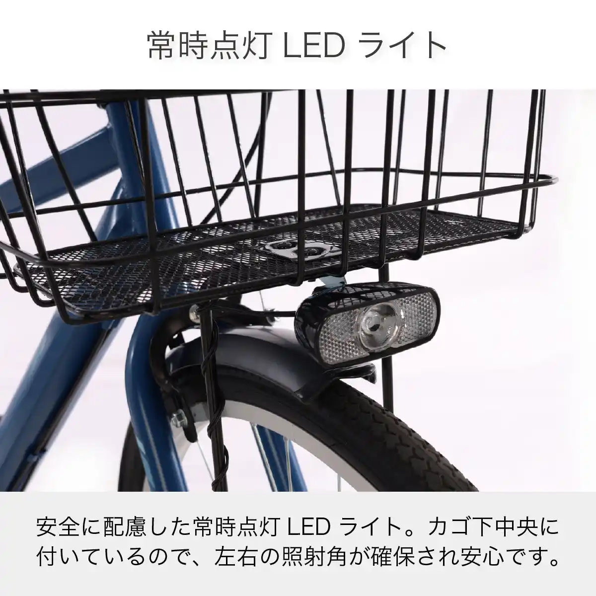 カゴ下中央には常時点灯のLEDライトを搭載しており、電池交換や充電の手間がなく、夜間や暗所でも周囲の状況を確認しやすく安全面に配慮した設計となっています。後輪にはリング錠を装備しており、駐輪時の防犯対策としても安心してご利用いただける仕様です。 |