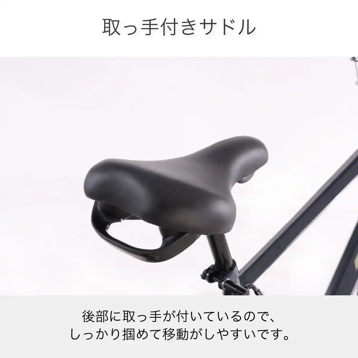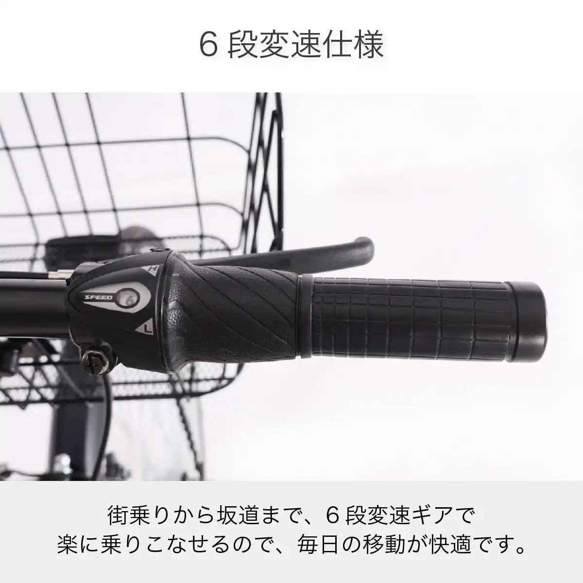 荷物を運びやすいカゴ付き仕様に加え、坂道や街中での走行にも対応した6段変速ギアを搭載しています。さらに、サドル後部に取っ手を設けることで、移動時の取り回しがしやすい設計となっています。 |