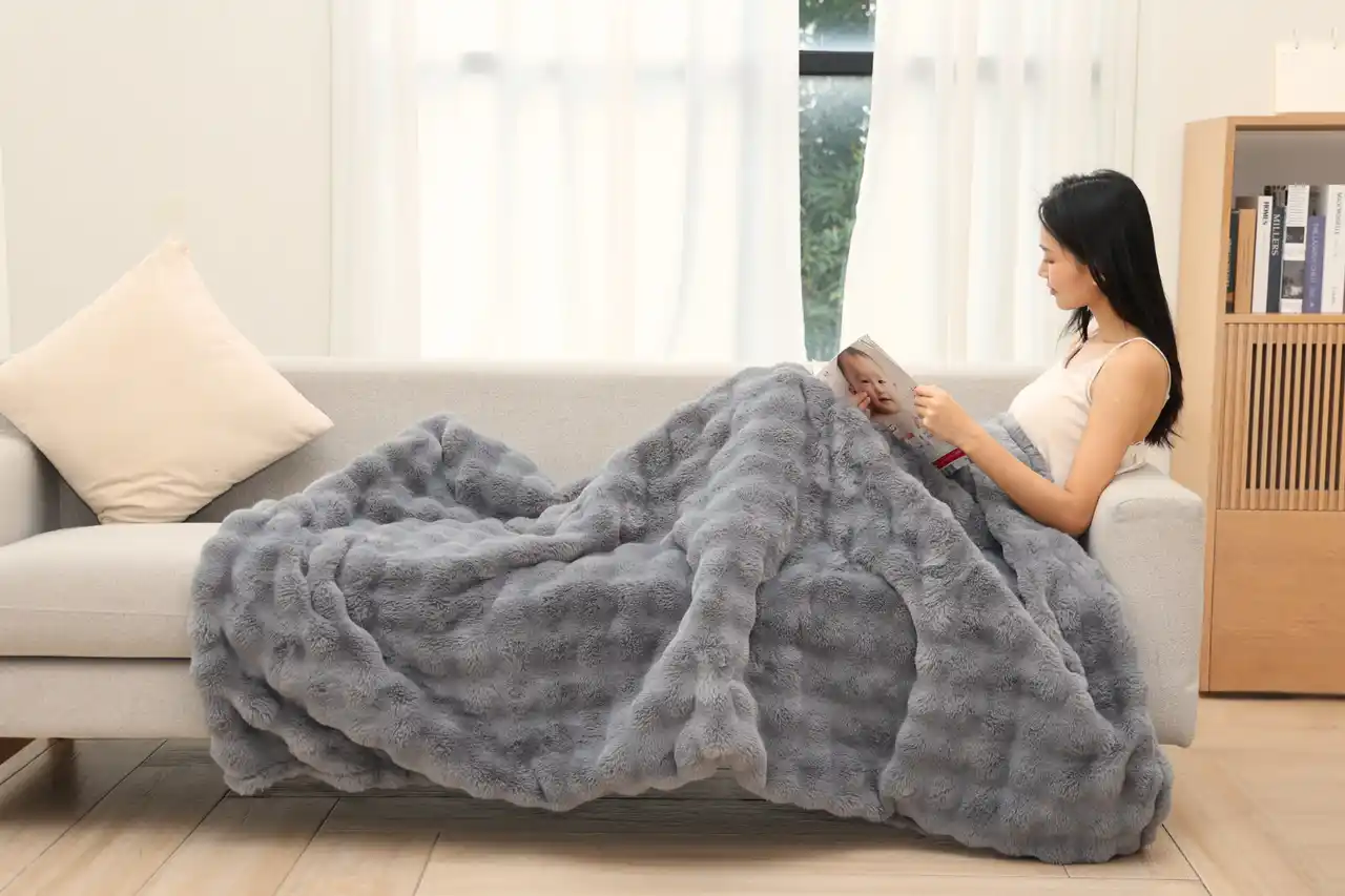 高密度の高級ラビットファー調素材を贅沢に採用。手に触れた瞬間、とろけるような滑らかさと上品な光沢が広がります。 毛足が長く、空気をしっかり閉じ込めることで、熱を逃がさず持続的に暖かい。 まるで「毛布自体が発熱しているかのような」心地よさで、朝まで極上のぬくもりをキープします。 |