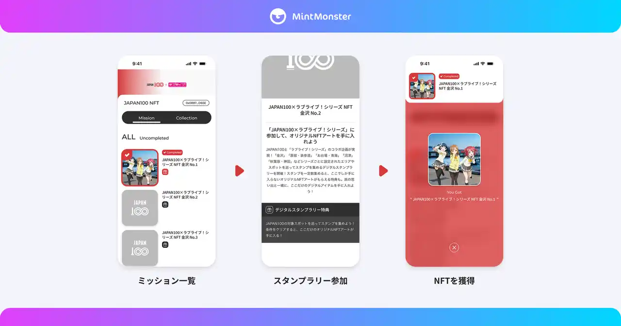「JAPAN100」は日本全国のカルチャースポットを発見・体験するデジタルスタンプラリーです。今回、ラブライブ!シリーズとのコラボレーション企画のスタンプラリーに従来のポイント付与だけでなく、NFT獲得機能を追加することを目的に「MintMonster」を活用します。 |