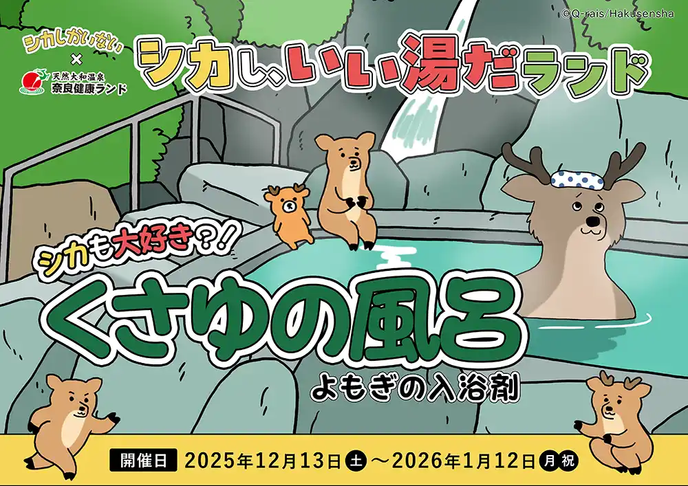 「たのしい」を世界中に届けるエンターテインメント・キャピタルの株式会社オリグレス(本社:東京都品川区、代表取締役社長:吉武優)は、絵本作家であり漫画家のキューライス氏による人気絵本『シカしかいない』(白泉社)と、奈良健康ランド 奈良プラザホテルのコラボイベント「シカし、いい湯だランド」を、2025年12月13日(土)から2026年1月12日(月・祝)までの期間、開催いたします。 |