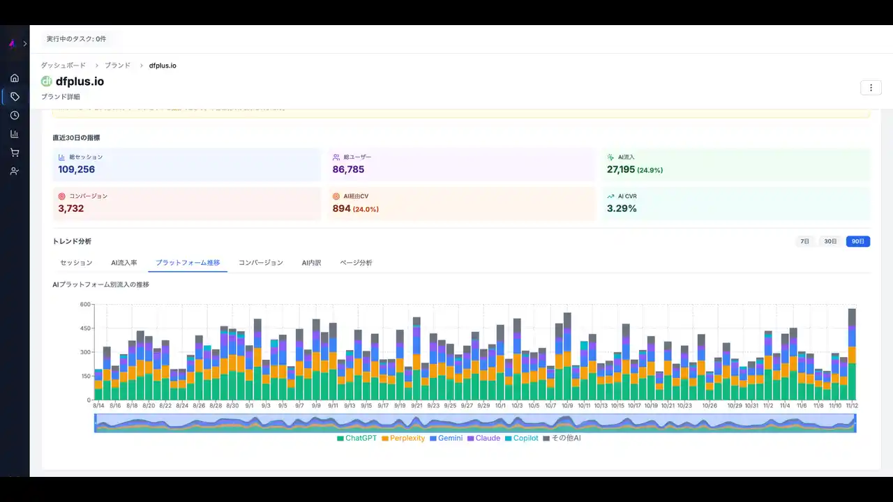 「Perplexityスコアは高いがサイト流入は少ない」「ChatGPTは流入数は多いがコンバージョン率が低い」といったチャネル別のギャップを発見し、どのAIプラットフォームへの対策を優先すべきかをデータドリブンに判断できます。 |