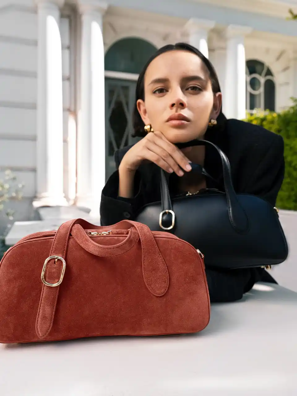 カジュアルなボストンバッグのフォルムに洗練されたエレガントな佇まいをプラス。上質なスウェードが更なる高級感を演出。 |