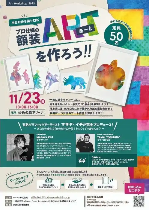 グラフィックアーティスト マサヤ・イチ(合同会社MONJU市/株式会社ANIMAREAL 代表)は、グラフィックデザイナーのタマイ ヨシヒロ氏と、自身らが主宰するギルド「Graphic Artist Guild(以降GAGという)」のメンバーとともに、2025年11月23日(日)、福島県大熊町にある『学び舎ゆめの森』にて親子向けワークショップ「プロ仕様の額装アートを作ろう!!」を開催することをお知らせいたします。 |