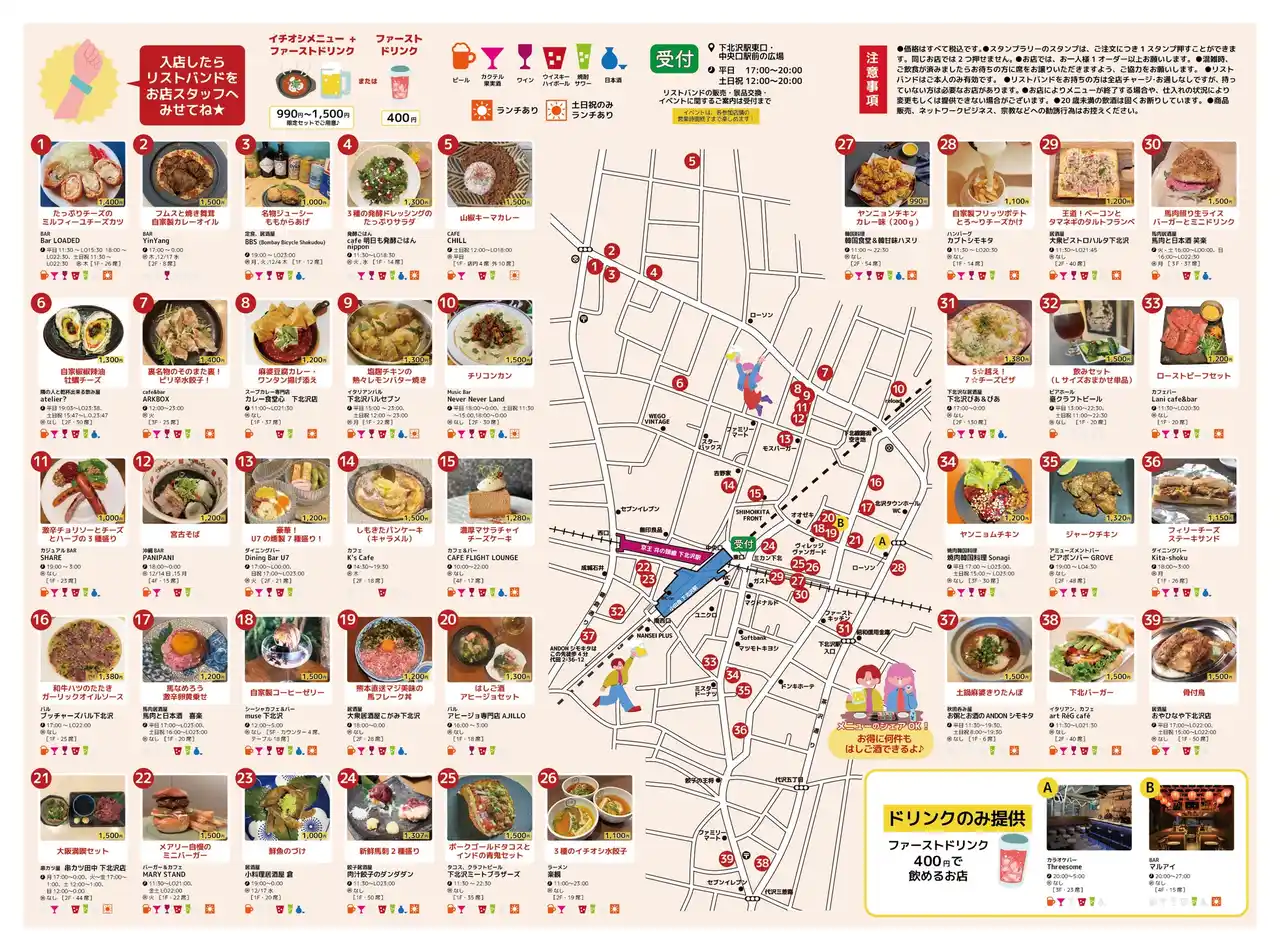 | また、 お店を巡るごとに景品がもらえるスタンプラリーも実施いたします。 ノンアルコールメニューもご用意しているため、お酒が飲めない方もご参加いただけます。気になるお店をはしごしながら、下北沢でしか味わえないおいしい出会いを、ぜひお楽しみください。 | ||||||||||||||||||