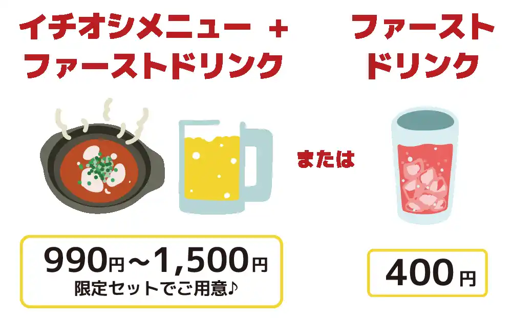| さらに、フードはこの期間だけの特別価格でご用意しています。限定セット(イチオシメニュー+ファーストドリンク)は、990円~1,500円にてご提供いたします。または、ファーストドリンクを400円で注文できます。イチオシメニューをシェアすれば、1軒あたり 1,000円 以下という神コスパ! | ||||||||||||||||||
