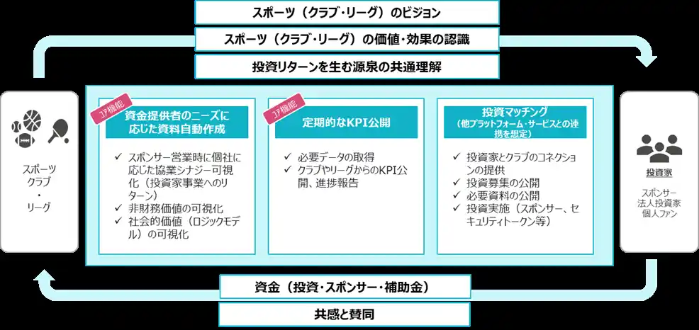 スポーツクラブやリーグと投資家とのコミュニケーションを促進し、資金調達の円滑化につながるプラットフォーム提供を構想しています。各クラブやリーグごとに、地域経済活性化や関係人口増加といった社会的インパクトをはじめ、投資や価値に関わるさまざまな情報を生成、一元的に取りまとめ、プラットフォームを通じて投資家に共有することで、資金調達の機会を得られやすくします。 |