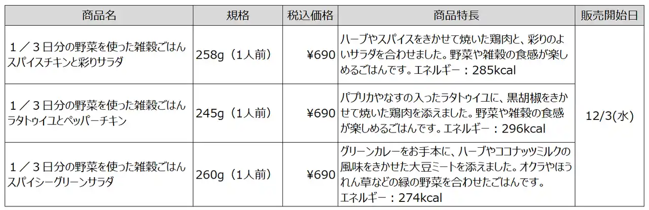 今回発売する「1/3日分の野菜を使った雑穀ごはん」は、不足しがちな野菜を手軽に摂取できるように考えた、温めるだけで食べられる1食分のプレートごはんで、「スパイスチキンと彩りサラダ」、「ラタトゥイユとペッパーチキン」、「スパイシーグリーンサラダ」の3種を発売します。 |