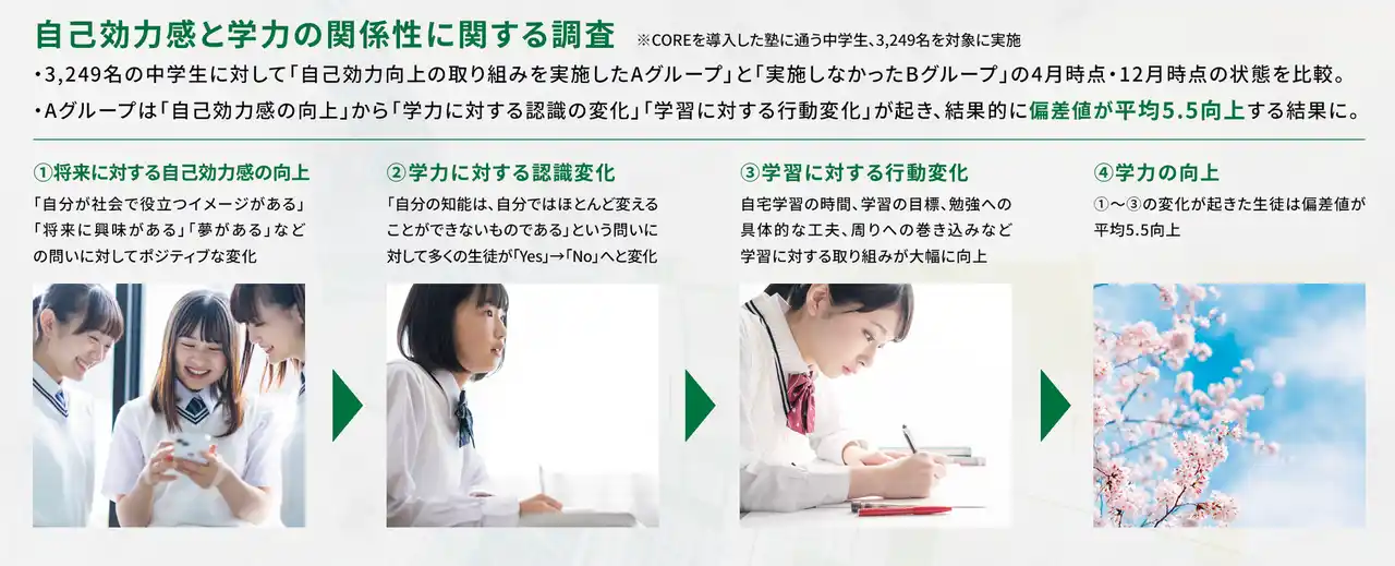 目的意識の明確化 → 自己効力感の向上 → 学習行動の変化(時間・工夫・目標・周囲の巻き込み) → 学力の伸長(偏差値) |
