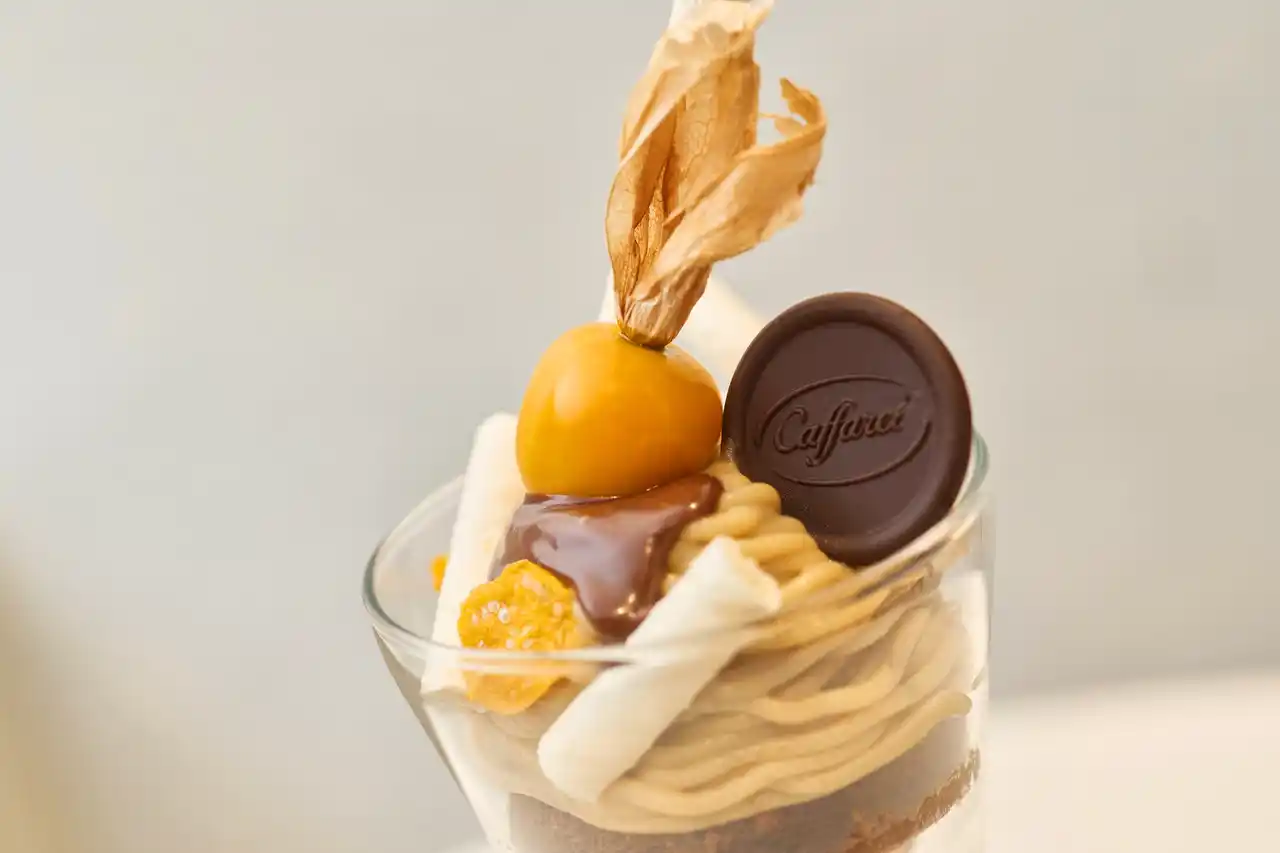 イタリア・トリノ発の老舗チョコレートブランド「Caffarel(カファレル)」の日本での総輸入代理店業務及び製造・小売事業を展開する株式会社山本商店は"食べられるほおずき(鬼灯)"を主役に、秋の味覚・栗と組み合わせた「"ほおずき"モンブランパフェ」を2025年11月15日(土)から期間限定で神戸北野本店にて販売いたします。ほおずきのほのかな酸味と、栗の濃厚な甘みが織りなす上品なハーモニー、見た目にも美しく、食べるたびに秋の深まりを感じる一品です。 |