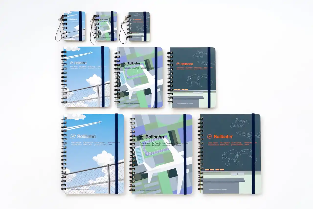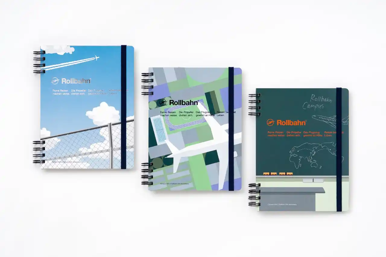 手に取った瞬間にまず感じるのは、見慣れたかたちに配された、いつもとは違うロゴの新鮮さ。ページを開くと、見慣れたノートには、5mm方眼・クリーム色のRollbahn専用用紙、一方でリングメモには、B罫(6mm幅)・ホワイトのCampus専用横罫用紙が綴じられています。 長年親しんだフォーマットの中に、ほんの少し異なるヒントを見つけたときの、“知っているのに初めて”という感覚。この小さな違和感が、ブランドが交わる瞬間の確かな証です。 ■コラボレーション限定デザインを配したステーショナリーも Campusが意味する「学校」と、Rollbahnが持つ「滑走路」という言葉が持つ空気や、ノートやメモ自身が見てきた風景を重ねながら、それぞれのらしさや違いをかたちにしました。未来や新しい世界を思わせるような構図で描いた「屋上」「飛行機」「黒板」の全3柄。周年を機にすれ違う、一瞬の“痕跡”を記録したデザインです。 |
