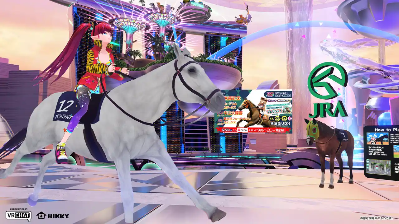 3度目の出展となる日本中央競馬会(JRA)は、パラリアル新宿とパラリアルシンガポールの両会場に競走馬を設置し、来場者は競走馬に乗って会場を巡ることが可能です。さらにVket Real2025 Winterへの出展も決定!JRAブースでは、VRゴーグルを被りながらロデオマシーンに乗って本格的なジョッキー体験が楽しめます。メタバースでもリアルでも、競走馬に乗って駆け巡ろう! |