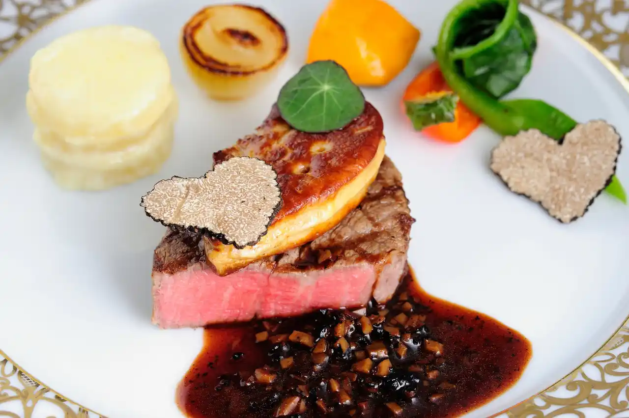 オマール海老を使用した彩り豊かな前菜や「黒毛和牛フィレ肉とフォアグラのロッシーニ」など、見た目も味わいも華やかな本格フレンチコース。 |