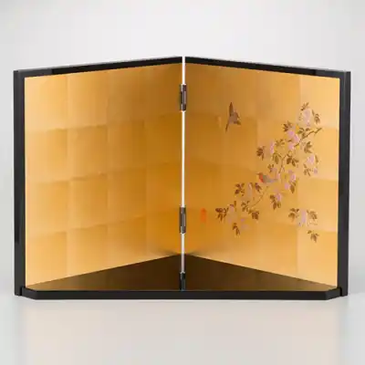 本商品は、春の訪れを象徴する「花」と「鳥」を優雅に描いた屏風に、上質な黒塗り台を組み合わせた一品。光の角度により織りなす金箔の艶やかな輝きが、空間全体を華やかに演出します。