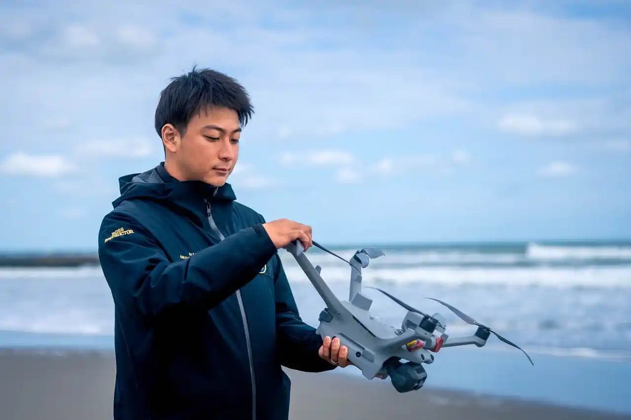 飛行前点検を行うNAPA ドローンアカデミーの認定インストラクター統括ボスインストラクター増田彪吾(ますだひゅうご)。安全管理体制を全国の導入企業・自治体に提供。 |