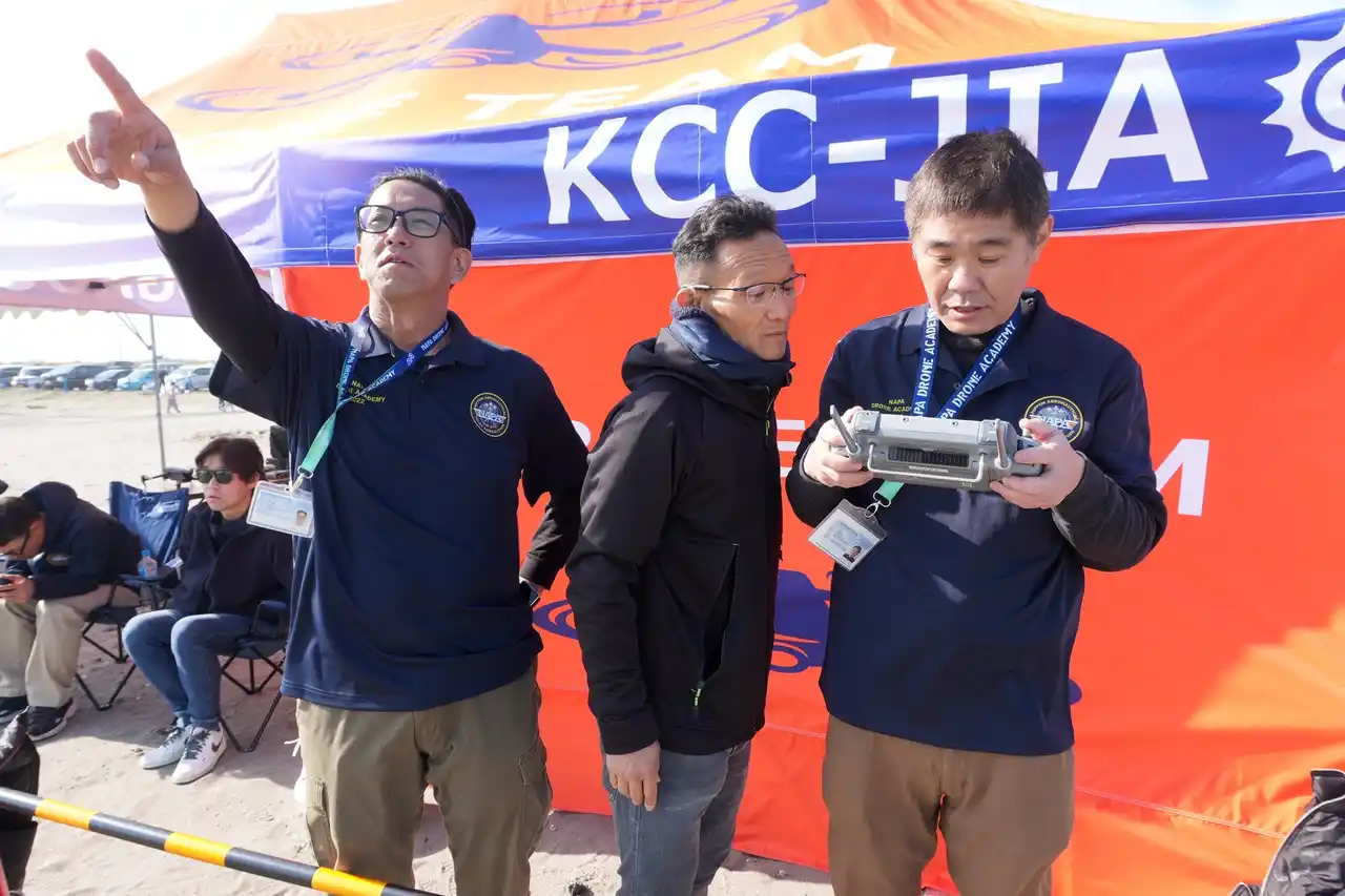 未来のドローンインストラクターを目指す候補生とNAPAドローンアカデミー千葉本校の田邊義房校長。 空撮・防災・警備・インフラ点検など、多様な現場に対応できる“プロフェッショナル人材”を育てています。 |