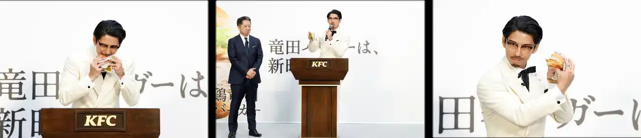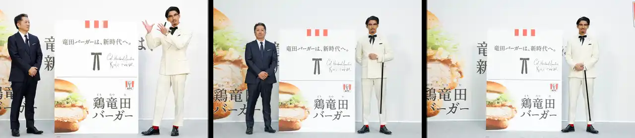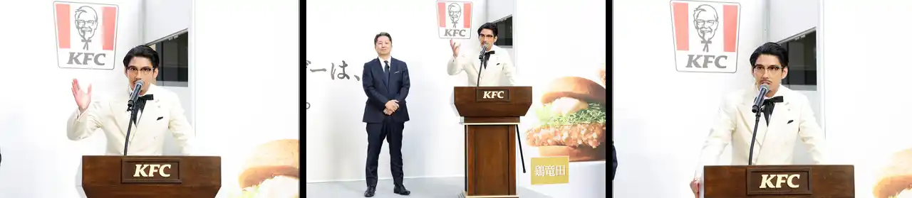 ゲストとして登壇した賀来賢人さんは、カーネル・サンダースの衣装に身を包んで登場し、会場を沸かせました。CMでもおなじみのキャラクターとして、「ケンタの鶏竜田バーガー」の魅力をプレゼン。さらに賀来さんは、「オリジナルチキンに負けないような、新たな竜田とKFCの融合」「世界中の皆さまにお披露目できるのがうれしい!」と自ら太鼓判を押し、その言葉に会場の新商品への期待は一段と高まりました。 |