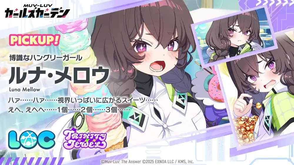合同会社EXNOA(本社:東京都港区、CEO:東條 寛、URL:https://games.dmm.com/)と株式会社KMS(本社:東京都千代田区、代表:梶原 健太郎、URL:http://kms3.com/ )が贈るマブラヴ最新作『マブラヴ ガールズガーデン』(以下、マブガル)が11月18日(火)より新チーム「トリニティ・ジュエル」より、SSR「ルナ・メロウ」が登場したことをお知らせいたします。 |