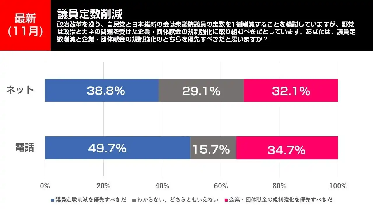 電話調査では議員定数削減を優先すべきとの回答が約半数を占め、ネットでは定数削減が企業・団体献金を若干上回る結果となりました。 |