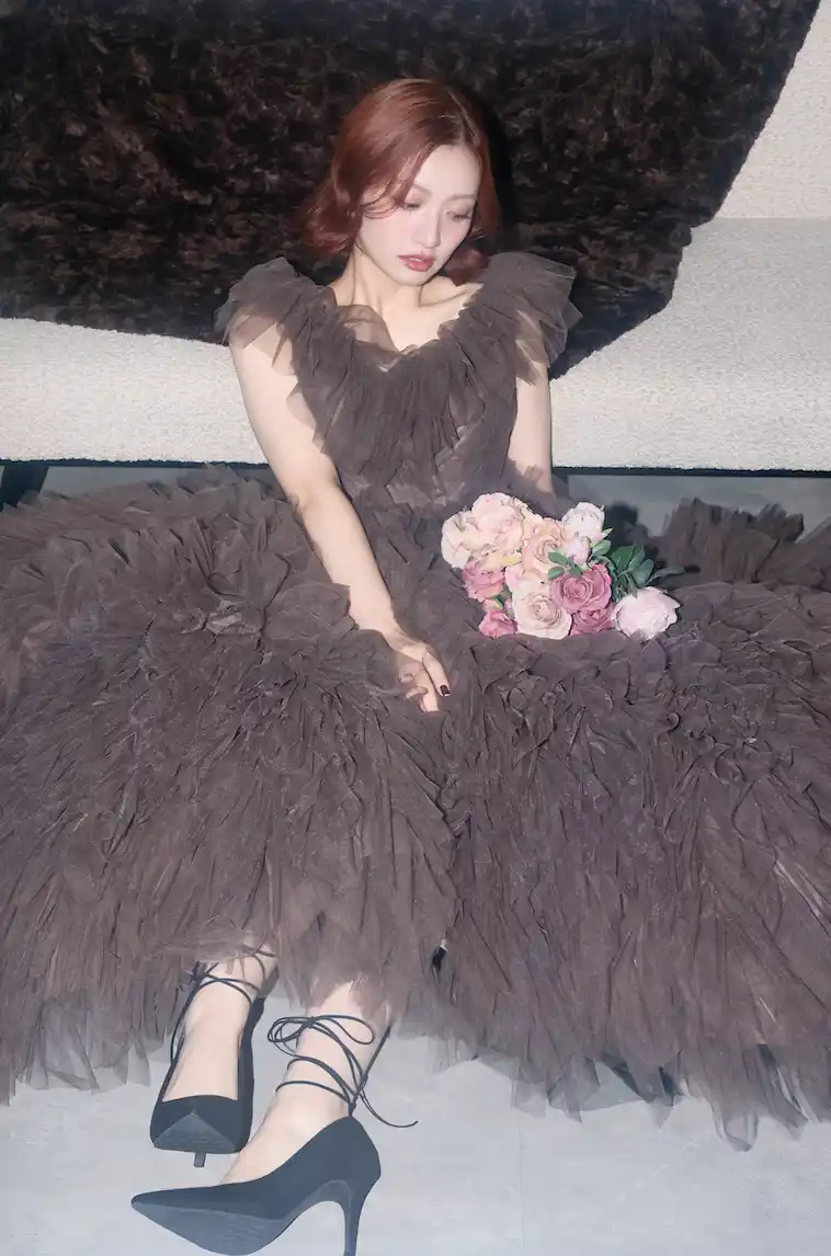 足元には編み上げリボンのピンヒールをちらっとのぞかせてエレガントな雰囲気に。 |