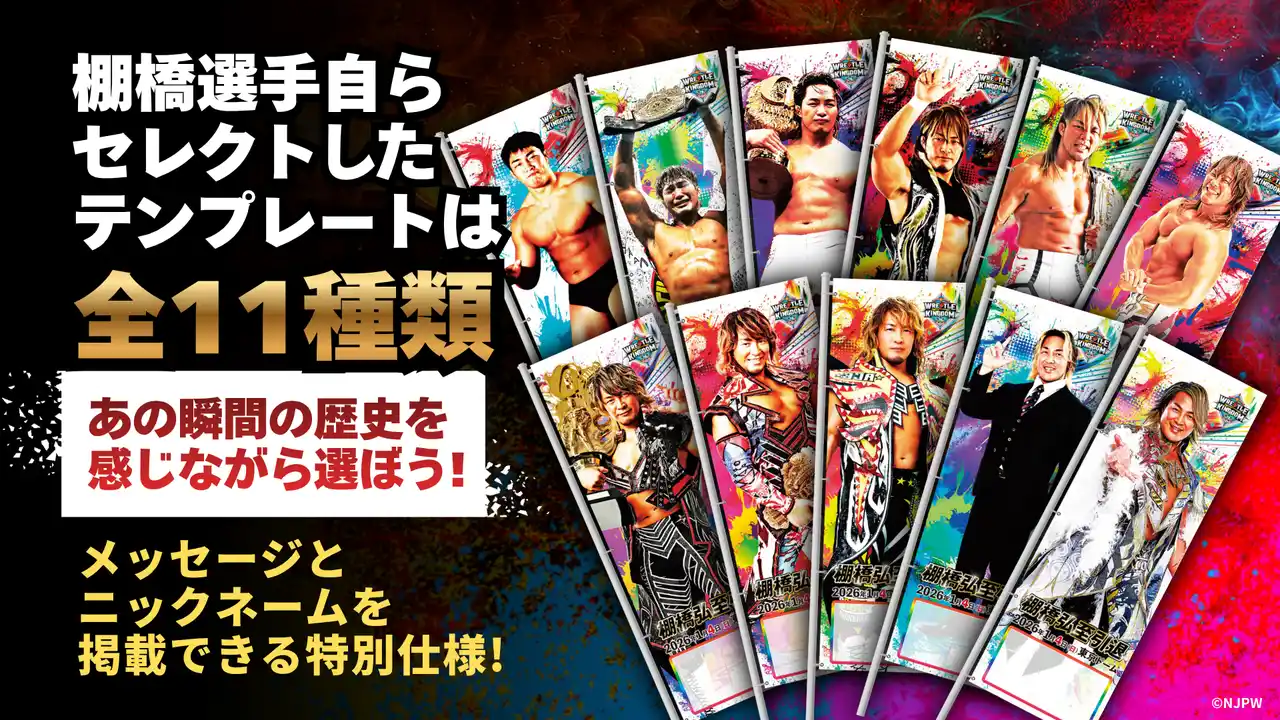 棚橋選手自身の“こだわり”と“歩んできた歴史”が詰まった11枚から、ファン一人ひとりが自身の記憶に残る1枚を選ぶことができます。 |