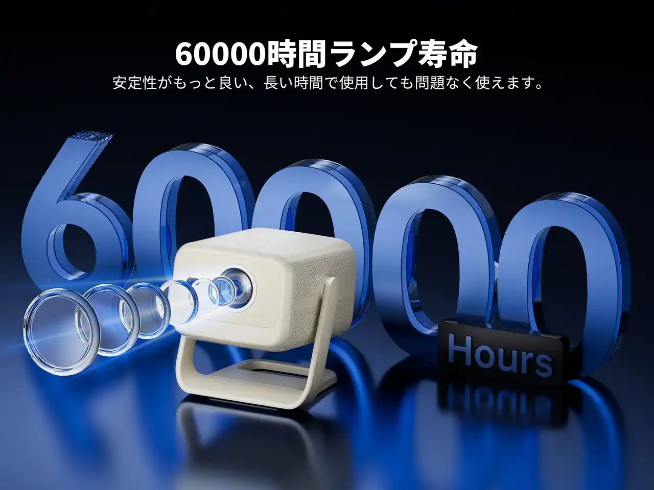 プロジェクターの弱点であるランプ寿命にも配慮。60000 時間という長寿命ランプを採用し、毎日 2 時間使用しても約 82 年間の使用が可能(計算上)。長い間、あなたのエンタメライフやビジネスシーンを支え続けます。 |