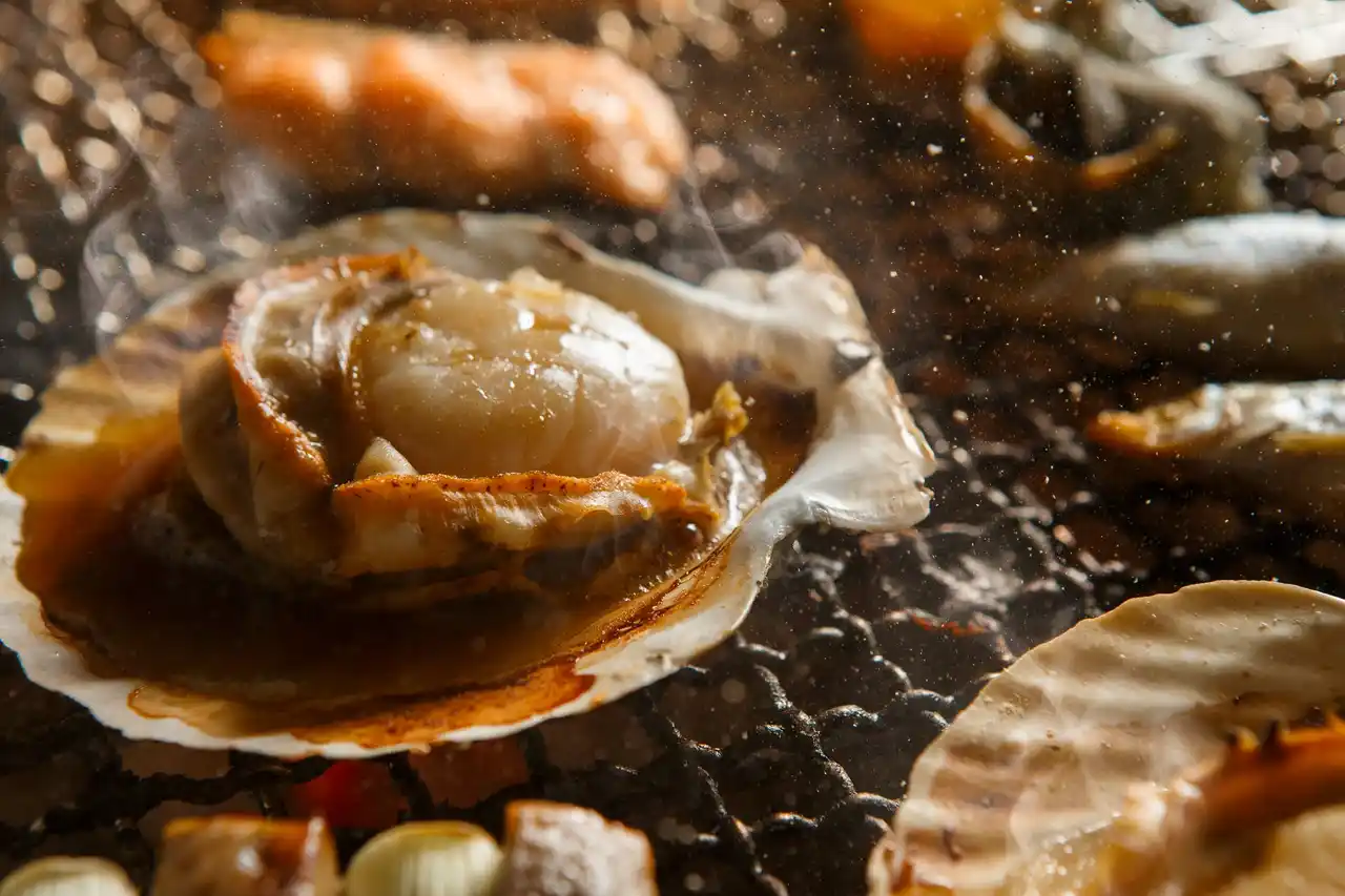 | 夕食は海鮮バイキング。旬の刺身や寿司、大人気の炉端コーナーではホタテやツブ貝などをご用意。 | |||||||||
