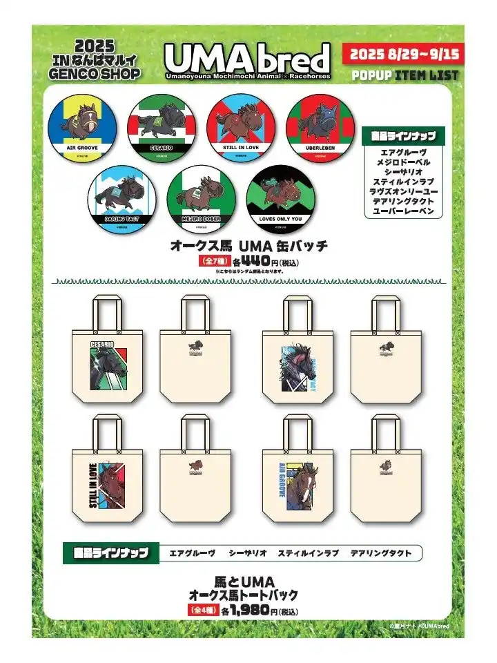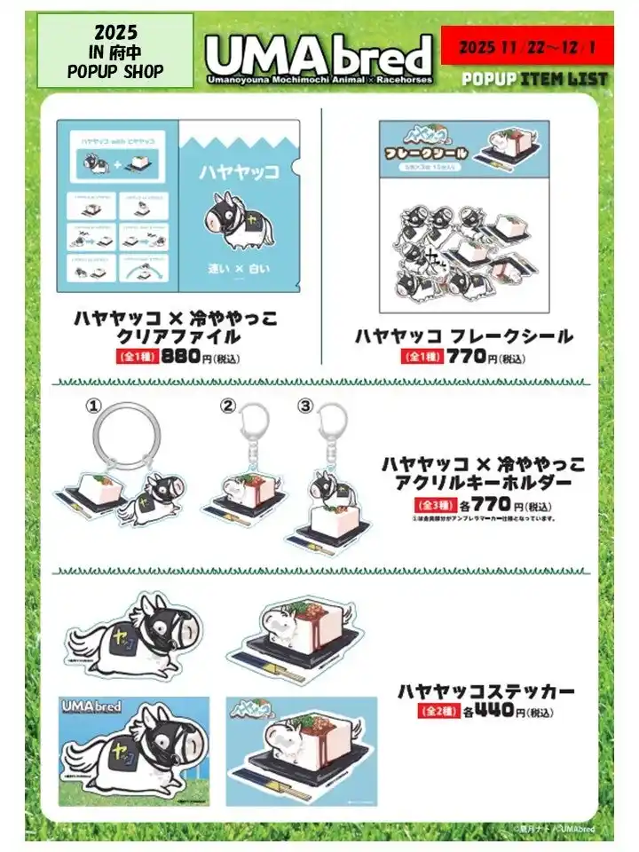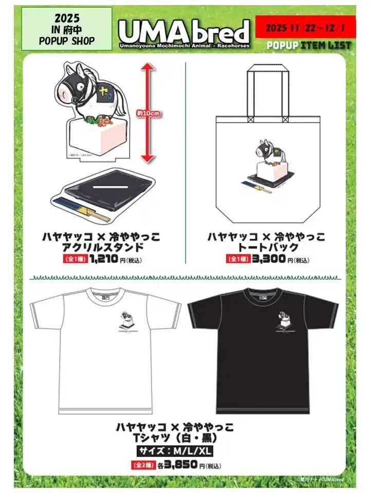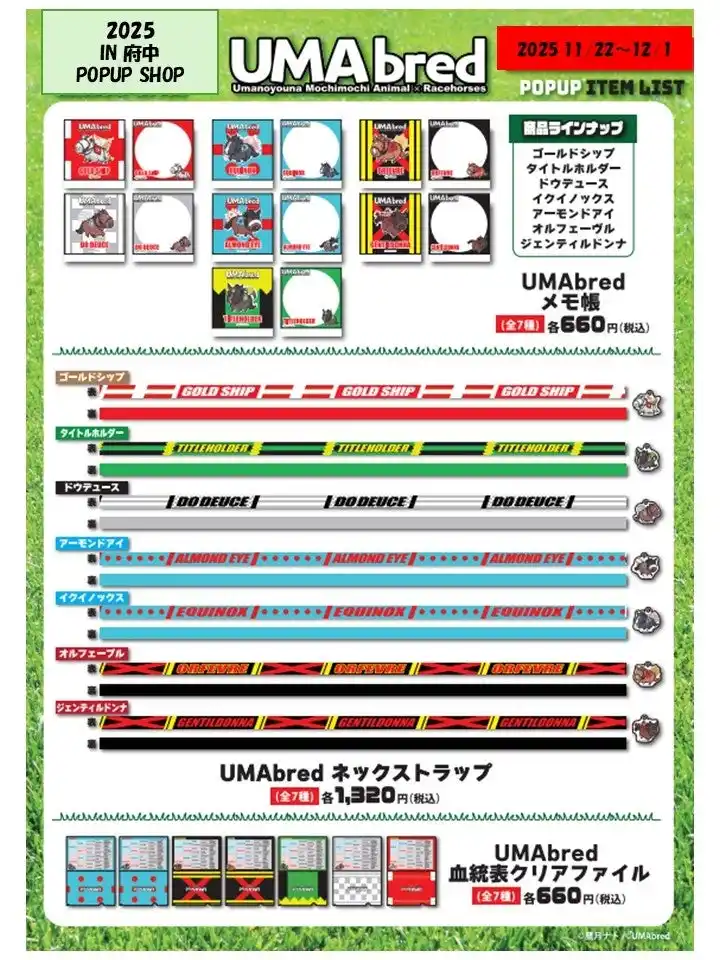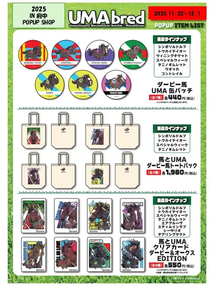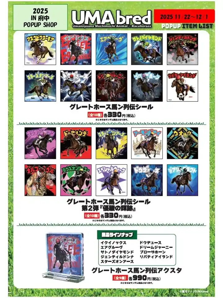 実在の競走馬・引退馬を「UMA」(ウマのようなモチモチアニマル)として描きおろすグッズブランド「UMAbred」は11/22より「UMAbred 大集結 ~府中 秋の陣~」と題し、従来のPOPUPよりも小規模なPOPUPを「サテライトPOPUP」として開催いたします。 |