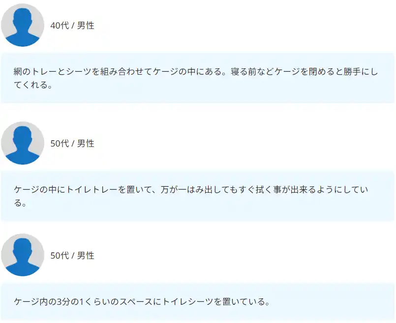 | 「ケージ内にトイレトレーやシーツを配置し、排泄場所をはっきり分けている」という声もいくつか寄せられました。 | ||||||||||||