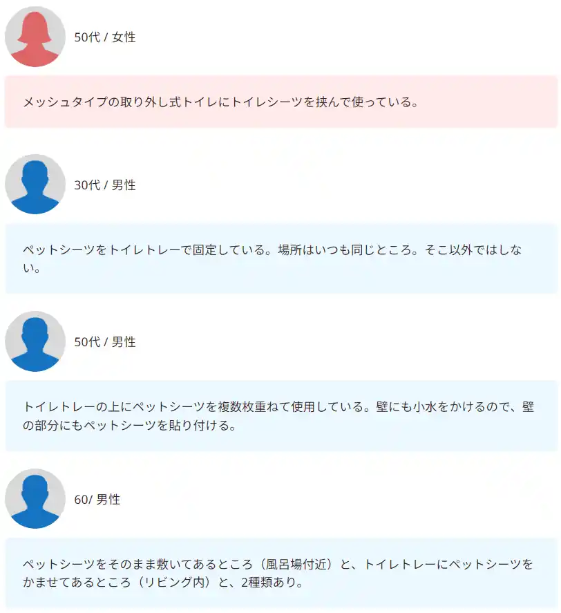| こちらは、多くの家庭で採用されている「トレー×シーツ」を利用している飼い主さんの声です。 | ||||||||||||
