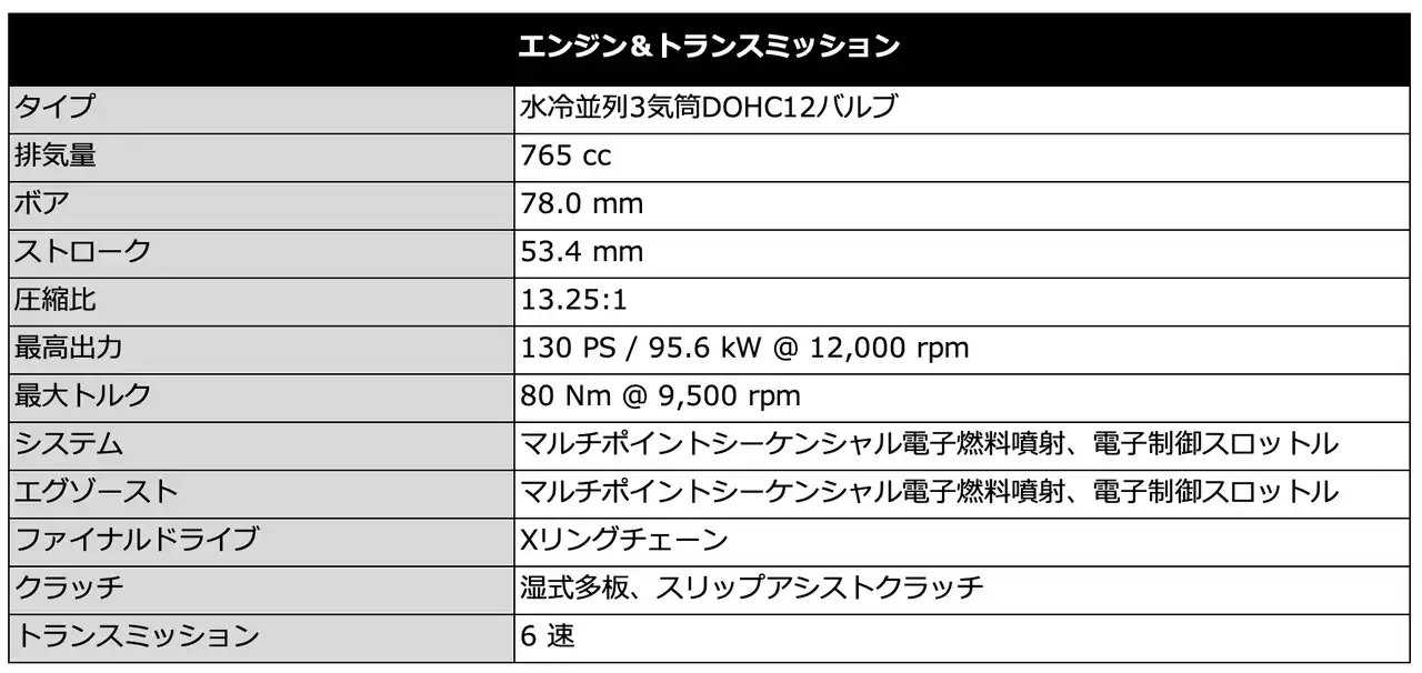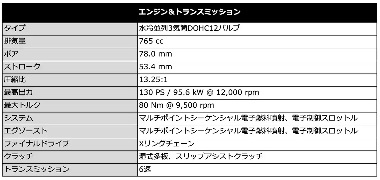 Moto2(TM)の環境下では、Triumphの765ccエンジンは極限まで追い込まれ、厳しい条件でも驚異的な耐久性と性能を発揮することが証明されています。この膨大なデータと経験は、Triumphエンジニアの開発に直接フィードバックされ、Street Tripleシリーズの改良へと確実につながっています。つまり、Moto2(TM)で培われた知見が耐久性・性能・レスポンスというTriumphエンジニアリングの強み を市販車レベルで体感できる形として反映されているのです。 |