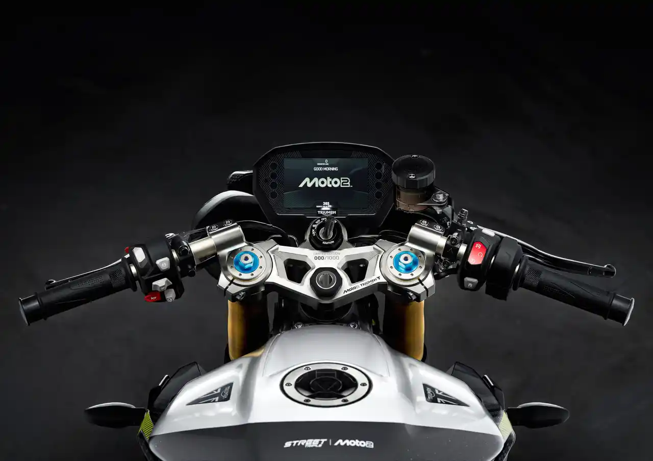 yellowのリアサブフレームと同色で統一されたホイールストライプを組み合わせ、レーシングDNAを強く感じさせるスタイリングを実現。また、ビレット削り出しのトップヨークには一台ずつ固有のシリアルナンバーが刻まれ、Moto2(TM)ブランドロゴと、Moto2(TM)専用スタートアップ画面を持つTFTディスプレイと並んで配置されることで、限定モデルならではの所有価値とコレクション性を際立たせています。 |